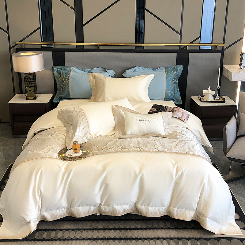 高精密浮雕刺绣提花+精致亮金线定位刺绣+被套拼接刺绣工艺+枕套拼接刺绣设计