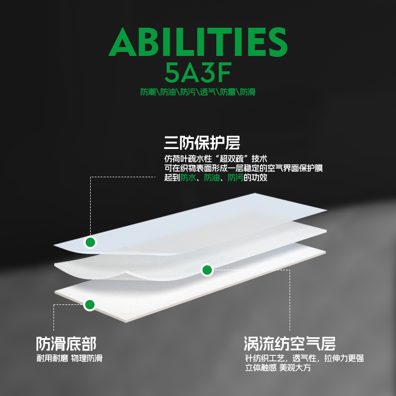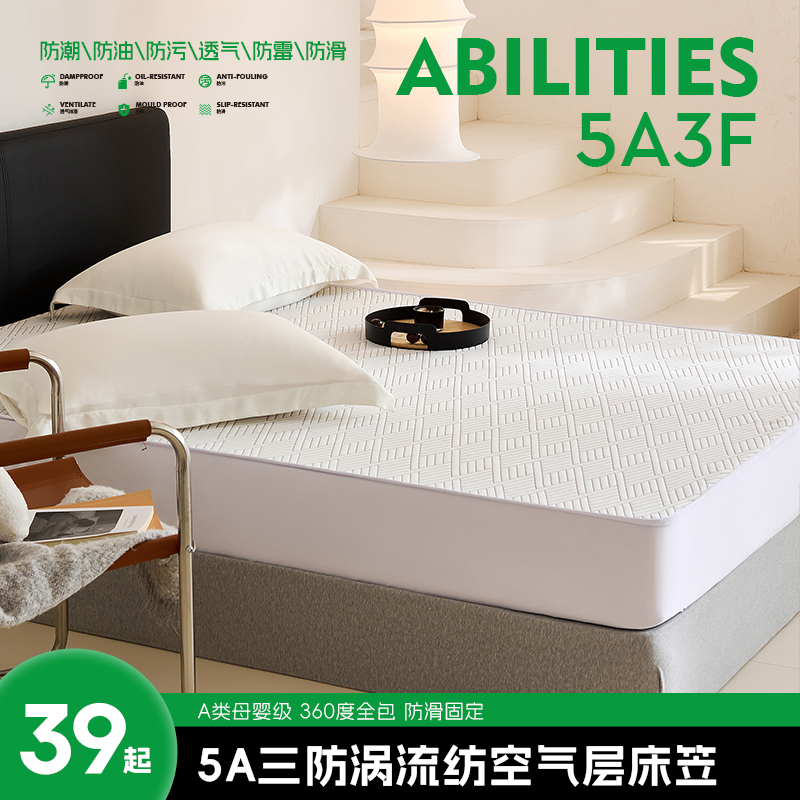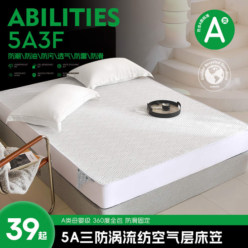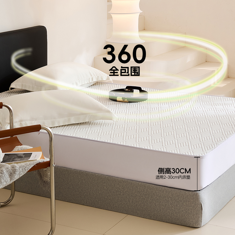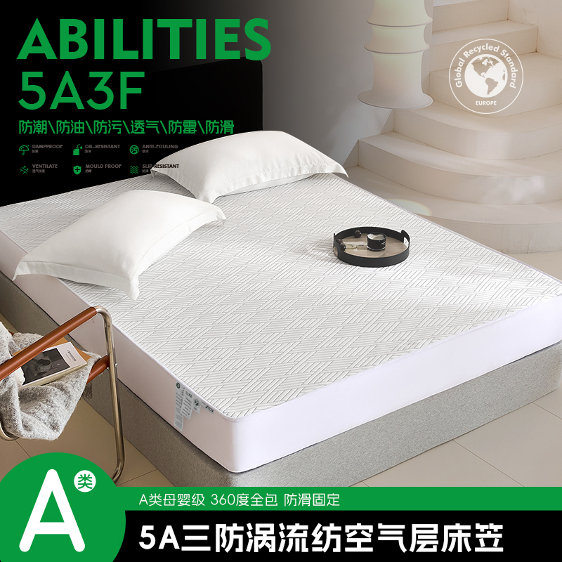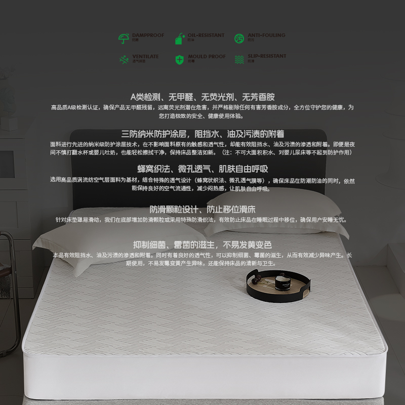 面料进行先进的纳米级防护涂层技术,在不影响面料原有的触感和透气性,却能有效阻挡水、油及污清的渗透;选用高品质涡流纺空气层面料为基材,结合特殊的透气设计,确保床品在防潮防油的同时,减少闷热感;针对床垫罩易滑动,我们在底部增加防滑颗粒或采用特殊防滑织法,有效防止床品在睡眠过程中移位;本品有效阻挡水、油及污渍的渗透和附着。同时有着良好的透气性,