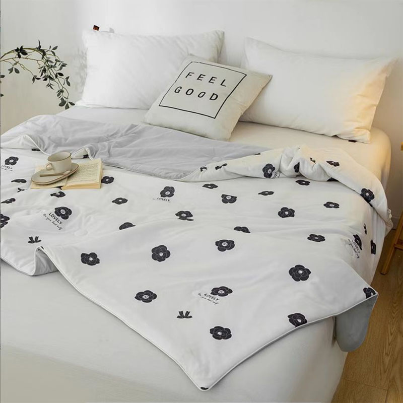 A面针织棉数码印花面料,花色靓丽,B面黑科技凉感丝,天热盖凉感面,天冷盖棉面,人性化设计,一被多用