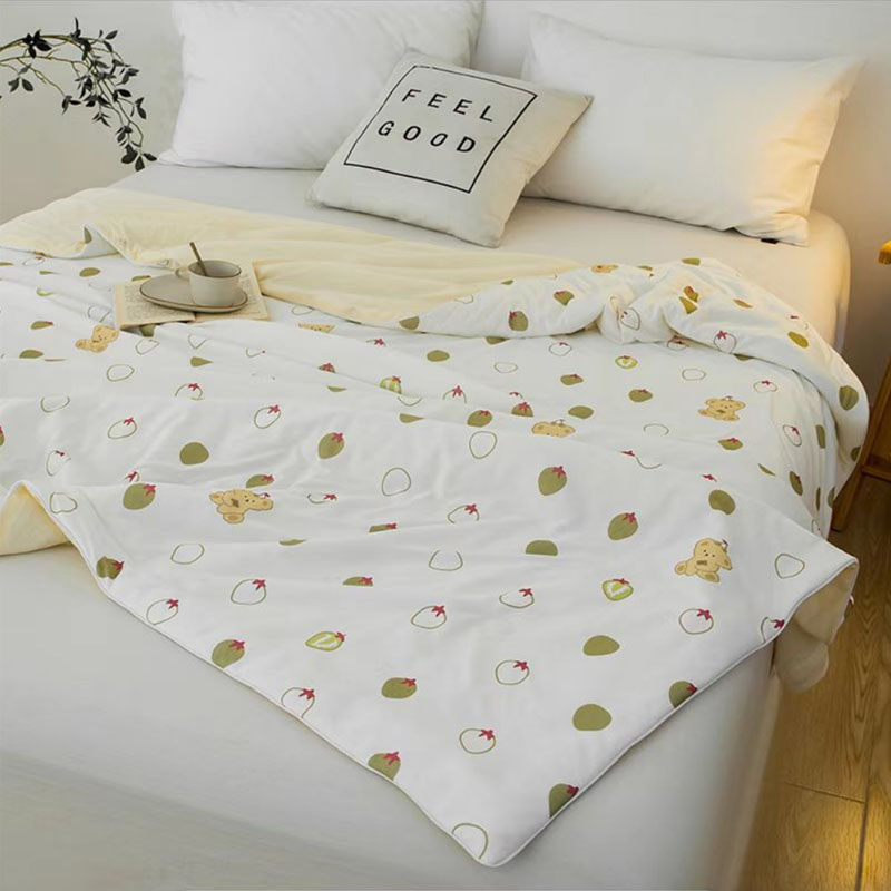 A面针织棉数码印花面料,花色靓丽,B面黑科技凉感丝,天热盖凉感面,天冷盖棉面,人性化设计,一被多用