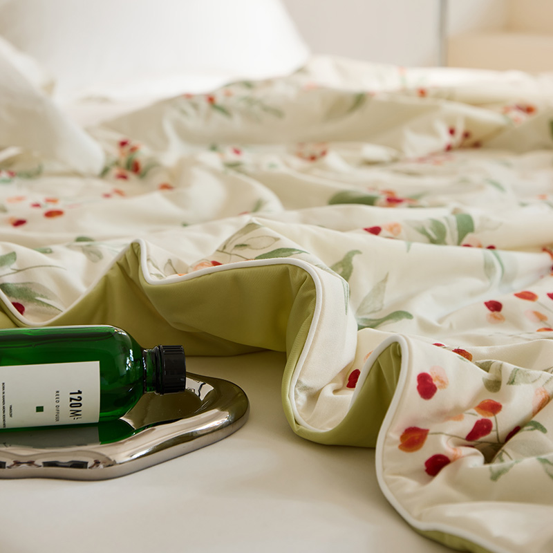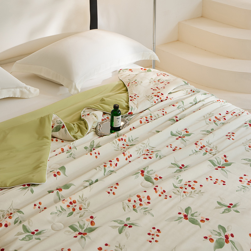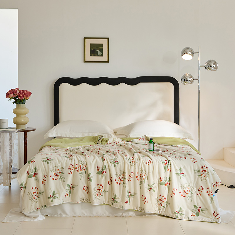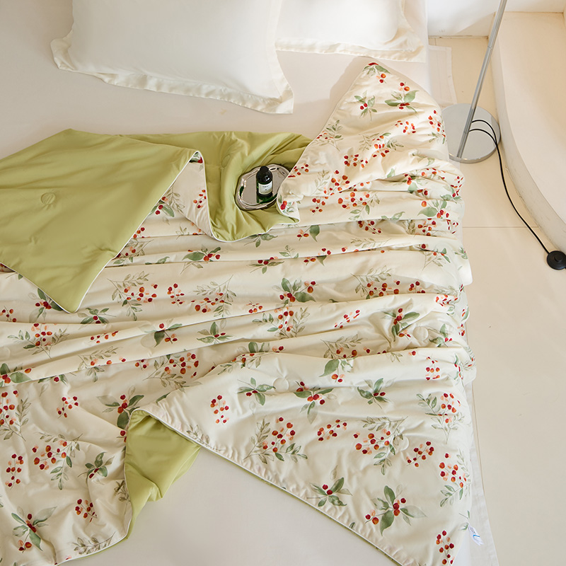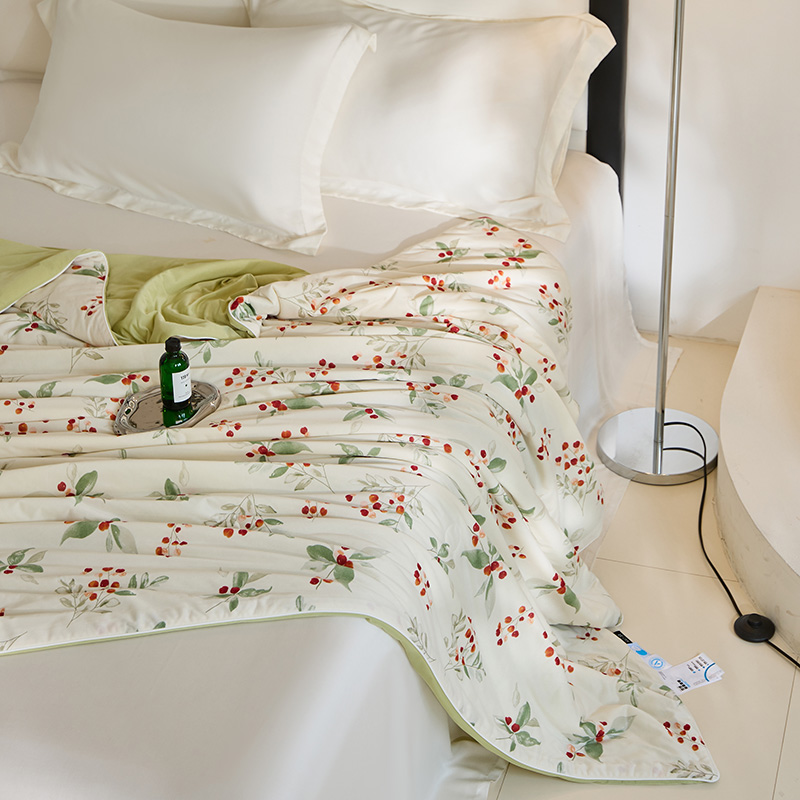 A面针织棉数码印花面料,花色靓丽,B面黑科技凉感丝,天热盖凉感面,天冷盖棉面,人性化设计,一被多用