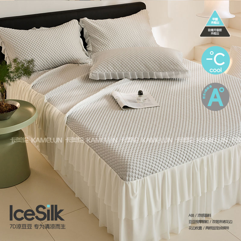 花边含氨纶,细腻柔滑有垂感,不易刮丝、勾丝、脱丝等,优雅双层床裙花边设计,增添层次感,让您的凉席充满美感。