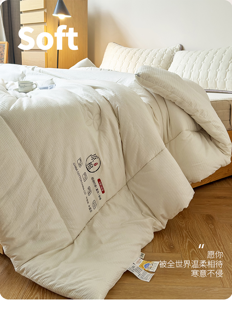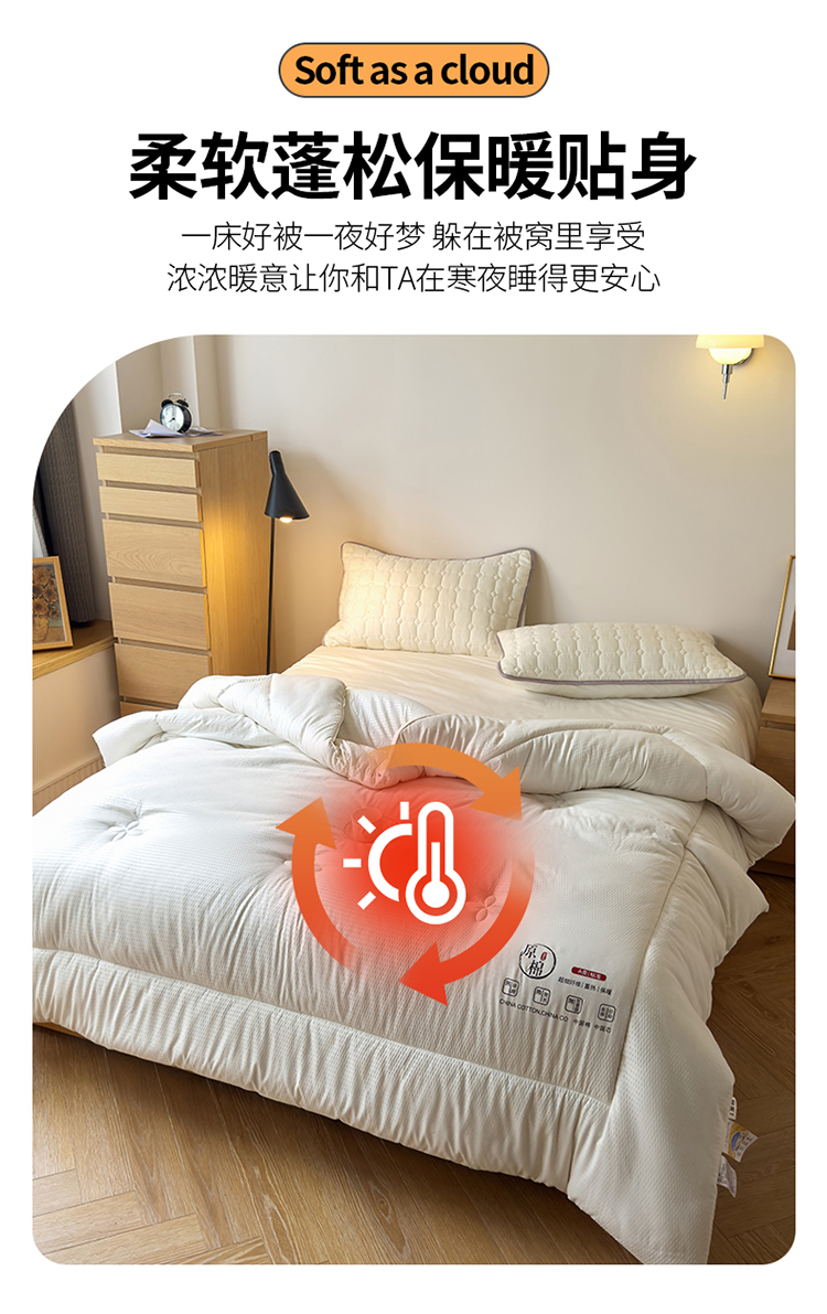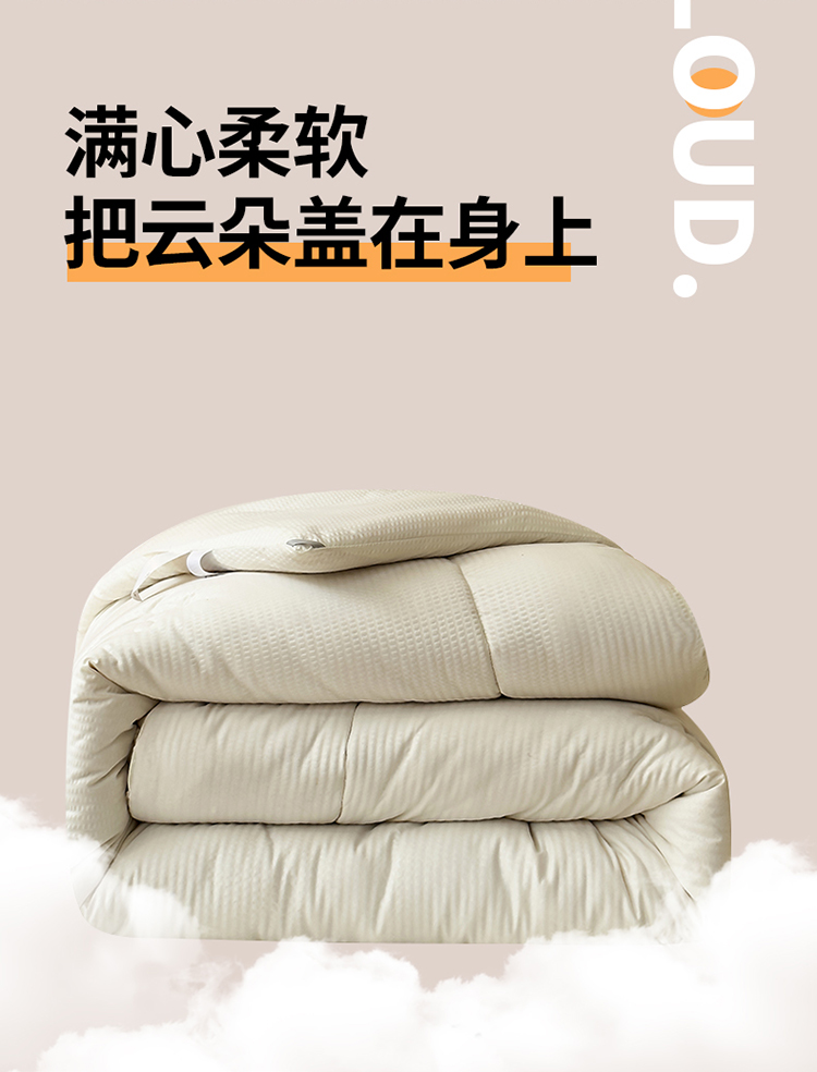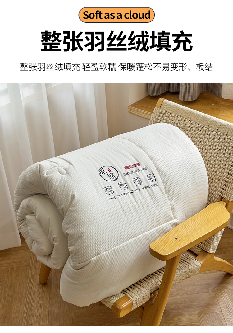 整张羽丝绒填充,轻盈软糯,保暖蓬松不易变形、板结。