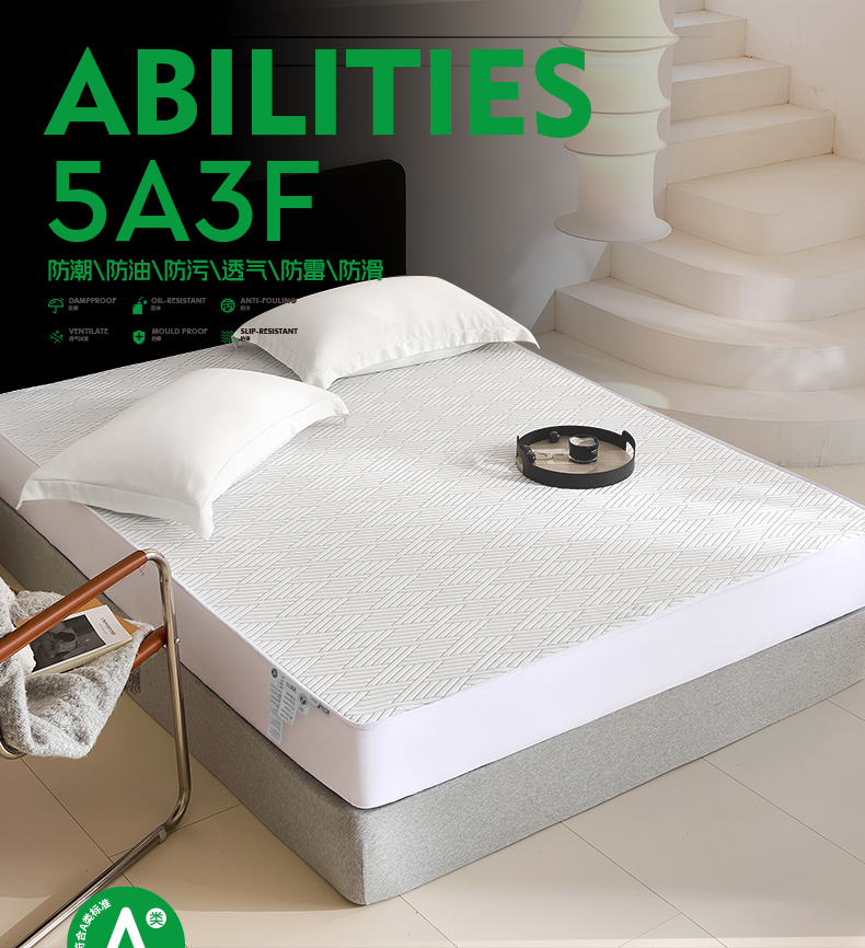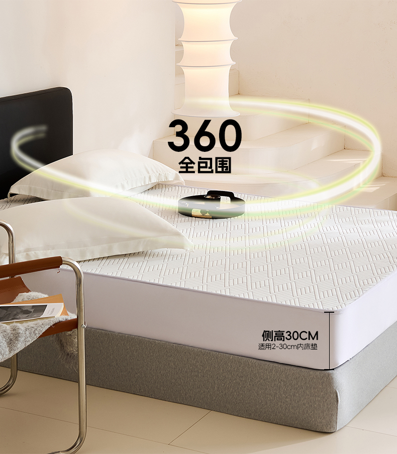 面料进行先进的纳米级防护涂层技术,在不影响面料原有的触感和透气性,却能有效阻挡水、油及污清的渗透;选用高品质涡流纺空气层面料为基材,结合特殊的透气设计,确保床品在防潮防油的同时,减少闷热感;针对床垫罩易滑动,我们在底部增加防滑颗粒或采用特殊防滑织法,有效防止床品在睡眠过程中移位;本品有效阻挡水、油及污渍的渗透和附着。同时有着良好的透气性,