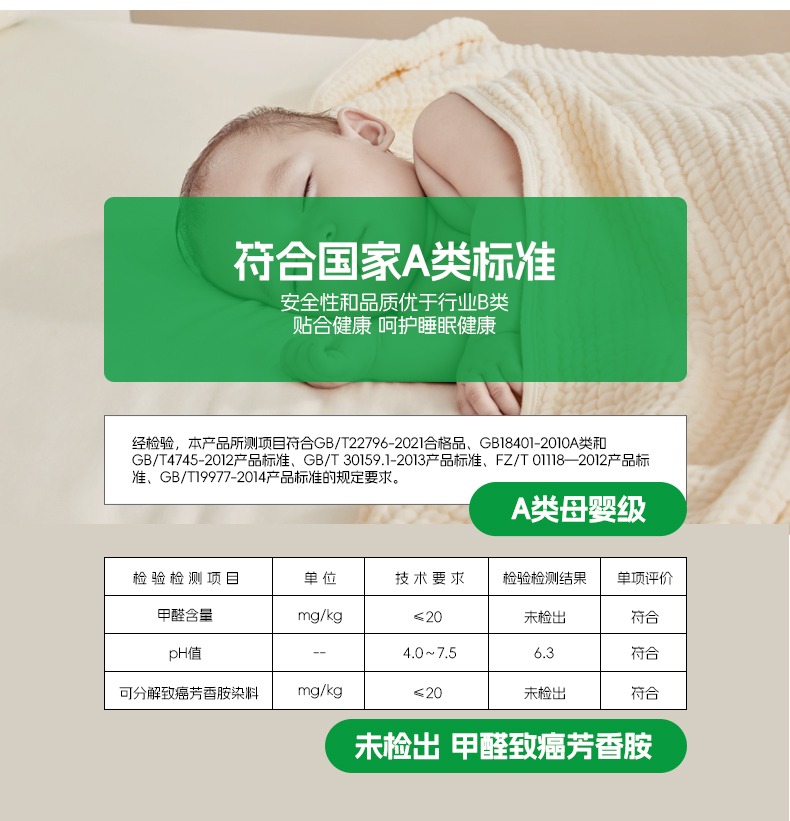 A类检测、无甲醛、无荧光剂、无芳香胺;